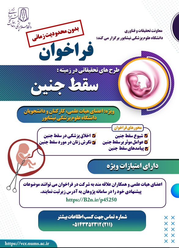 همچنین فراخوان حمایت از طرحهای تحقیقاتی در زمینه «سقط جنین» نیز تمدید شده و این فراخوان برای اعضای هیأت علمی، تمامی کارکنان و دانشجویان دانشگاه علوم پزشکی نیشابور برگزار میشود. محورهای این فراخوان عبارتند از: شیوع سقط جنین، عوامل موثر بر سقط جنین، پیامدهای سقط جنین، اخلاق پزشکی در سقط جنین، و نگرش زنان در مورد سقط جنین.