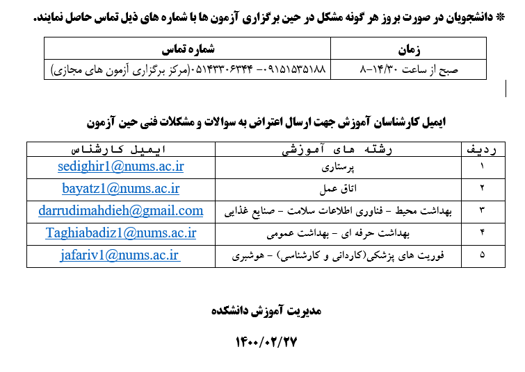 15- دانشجویان باید هر گونه اعتراض به سوالات و همچنین مشکلات فنی ایجاد شده در حین برگزاری آزمون را بلافاصله از طریق ایمیل به اطلاع کارشناس محترم رشته مربوطه برسانند. گذشت زمان امکان بررسی مشکلات را با مشکل روبرو خواهد نمود.