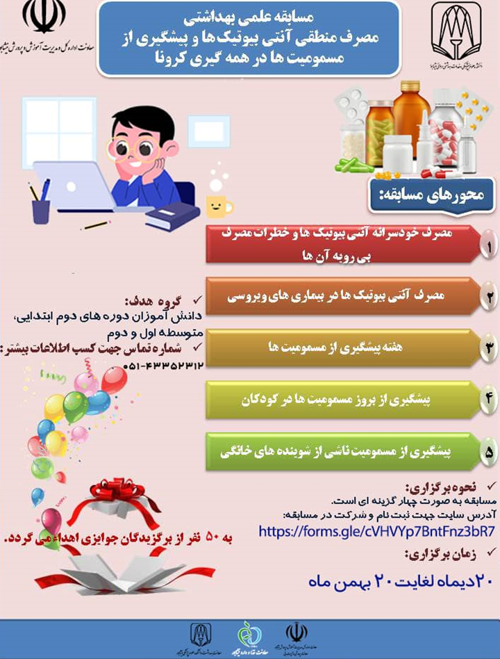 مسابقه علمی بهداشتی مصرف منطقی انتی بیوتیک ها و پیشگیری از مسمومیت ها در همه گیری کرونا ویژه گروه هدف دانش آموزان دوره های دوم ابتدایی، متوسطه اول و دوم با همکاری معاونت بهداشت، معاونت غذا و دارو و آموزش و پرورش شهرستان نیشابور از 20 دی ماه الی 20 بهمن ماه در حال برگزاری می باشد که به 50 نفر از برگزیدگان جوایزی اهدا می گردد.