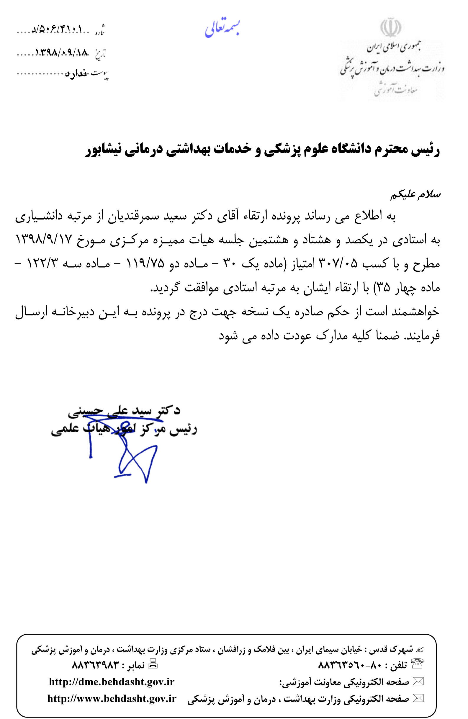 به گزارش خبرنگار وبدا،دریکصدوهشتادمین جلسه هیأت ممیزه مورخ 98/9/17 دکتر سعید سمرقندیان عضوهیأت علمی گروه علوم پایه دانشکده، از مرتبه دانشیاری به مرتبه استادی ارتقاء یافت.