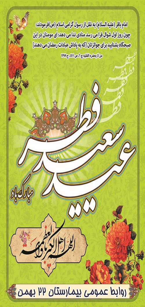 مدیریت بیمارستان 22بهمن در پیامی عید سعید فطر را به تمامی همکاران و کارکنان دانشکده علوم پزشکی نیشابور و پرسنل زحمتکش بیمارستان 22بهمن که با تلاش مضاعف در ماه مبارک رمضان لبخند رضایت را بر لب بیماران و همراهیان نشاندند تبریک گفت .