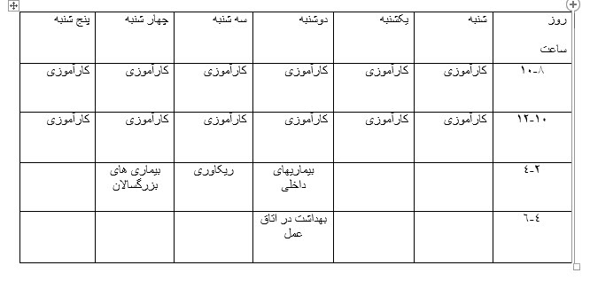 مربی کارآموزی اورژانس رشته هوشبری نیمسال دوم 1395 به ارزش 11 واحد مربی کارآموزی ccu رشته هوشبری نیمسال دوم 1395 به ارزش 9 واحد مربی کارآموزی اصول و فنون رشته پرستاری نیمسال دوم 1395 به ارزش 6 واحد مربی کارآموزی ccu رشته پرستاری نیمسال دوم 1395 به ارزش 2 واحد مربی کارآموزی icu رشته پرستاری نیمسال دوم 1395 به ارزش 6 واحد مربی کارآموزی بخش سوختگی رشته پرستاری ترم تابستانه به ارزش 1 واحد مربی کارآموزی بخش مصمومین رشته پرستاری ترم تابستانه به ارزش 1 واحد مربی کارآموزی اورژانس رشته اتاق عمل نیمسال اول 1396 به ارزش 14 واحد مربی کارآموزی اصول و فنون رشته اتاق عمل نیمسال اول 1396 به ارزش 2 واحد تدریس درس اصول کمک های اولیه رشته هوشبری، نیمسال اول 1396 به ارزش 2 واحد تدریس درس بهداشت در اتاق عمل رشته اتاق عمل نیمسال دوم 1396 به ارزش 2 واحد تدریس درس بیماری های داخلی (قلب) رشته اتاق عمل، نیمسال دوم 1396 به ارزش 1 واحد تدریس درس اصول مراقبت های پیشرفته در اتاق ریکاوری رشته اتاق عمل نیمسال دوم 1396 به ارزش 1 واحد تدریس درس بیماریهای بزرگسالان رشته پرستاری نیمسال دوم 1396 به ارزش 1 واحد مربی کارآموزی اورژانس رشته هوشبری نیمسال دوم 1396 به ارزش 10 واحد مربی کارآموزی icu رشته اتاق عمل نیمسال دوم 1396 به ارزش 1 واحد مربی کارآموزی ccu رشته اتاق عمل نیمسال دوم 1396 به ارزش 1 واحد
